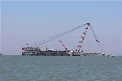 北溪水閘改建工程北港交通橋預(yù)制梁鋪設(shè)完成